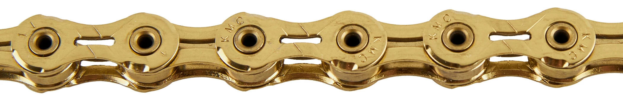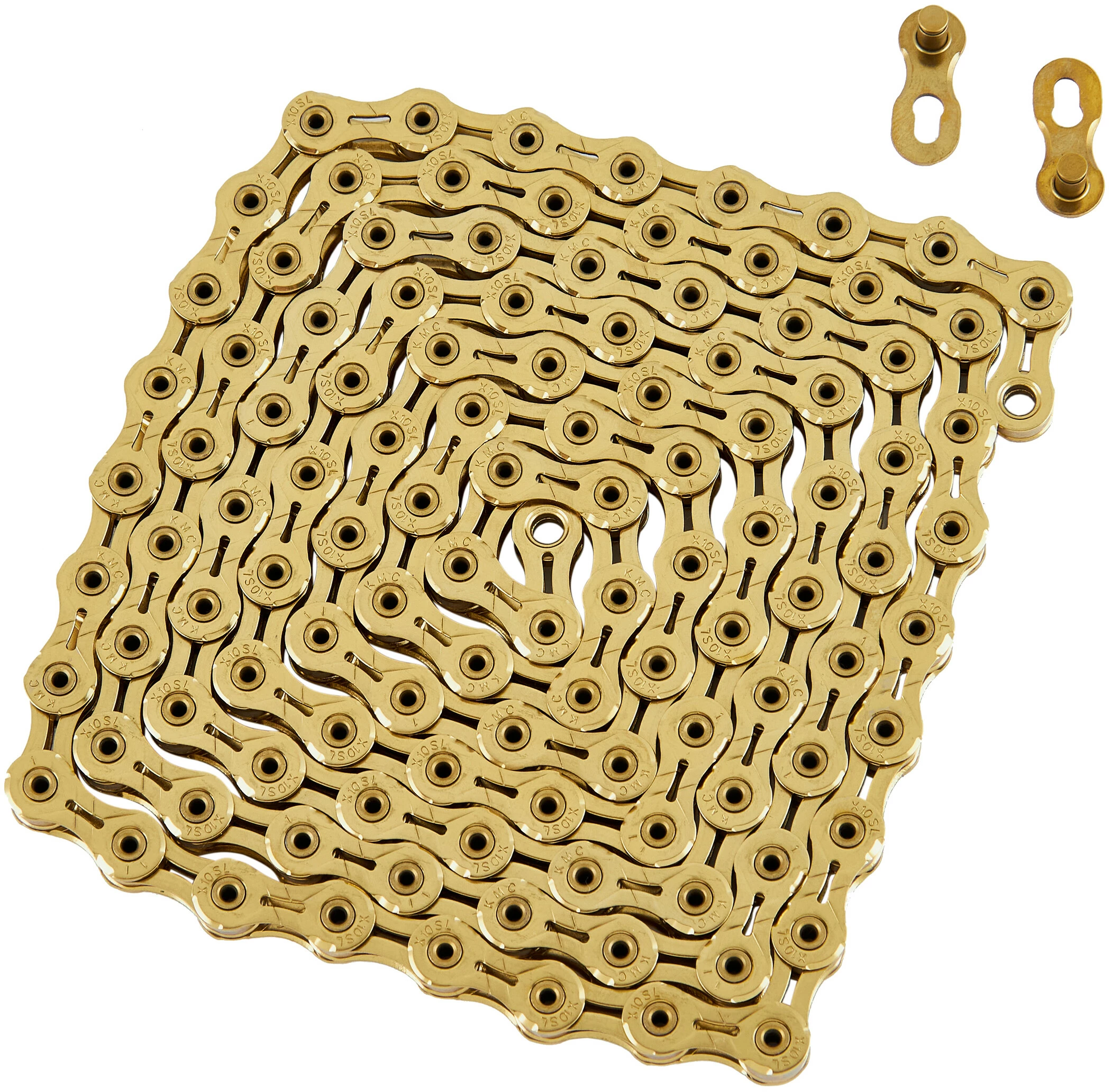KMC X-10-SL TI-N Kette (10-fach) für Shimano, Campagnolo und SRAM. Ausgestattet mit ausgefrästen Kettengliedern. Aus superleichtem, festem und Titan Nitrid Gold-Beschichtung.